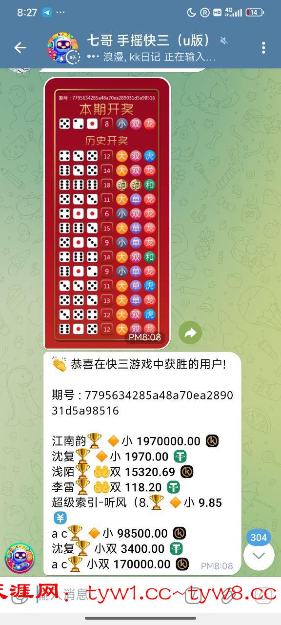 500U本金,玩快三一把草中小双3400u打上6170u给老哥们团888,还是那句话:怕输是赢不到钱的,祝天涯老哥们一路长虹