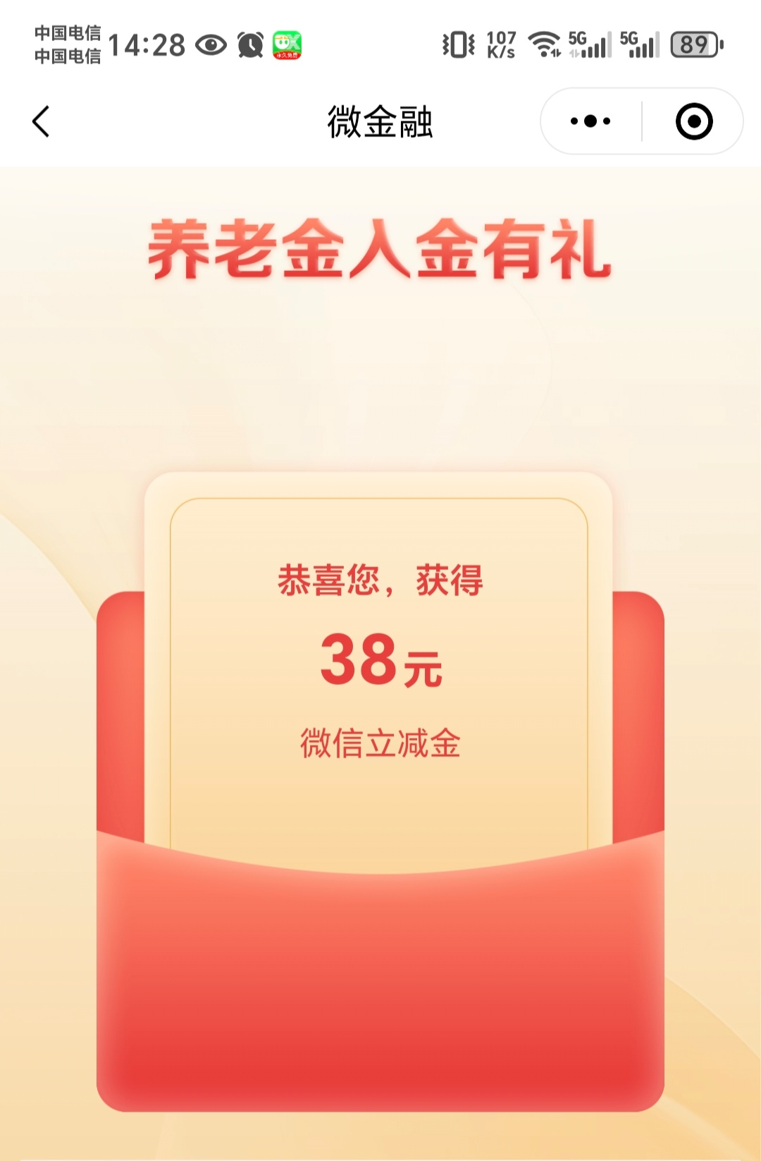 微信扫码打开或者搜微金融找到养老金开通领,可以买东西或者上分我领到了 38。其它银行应该也有这个活动老哥们可以去看看。没有工商卡的其他卡也可以