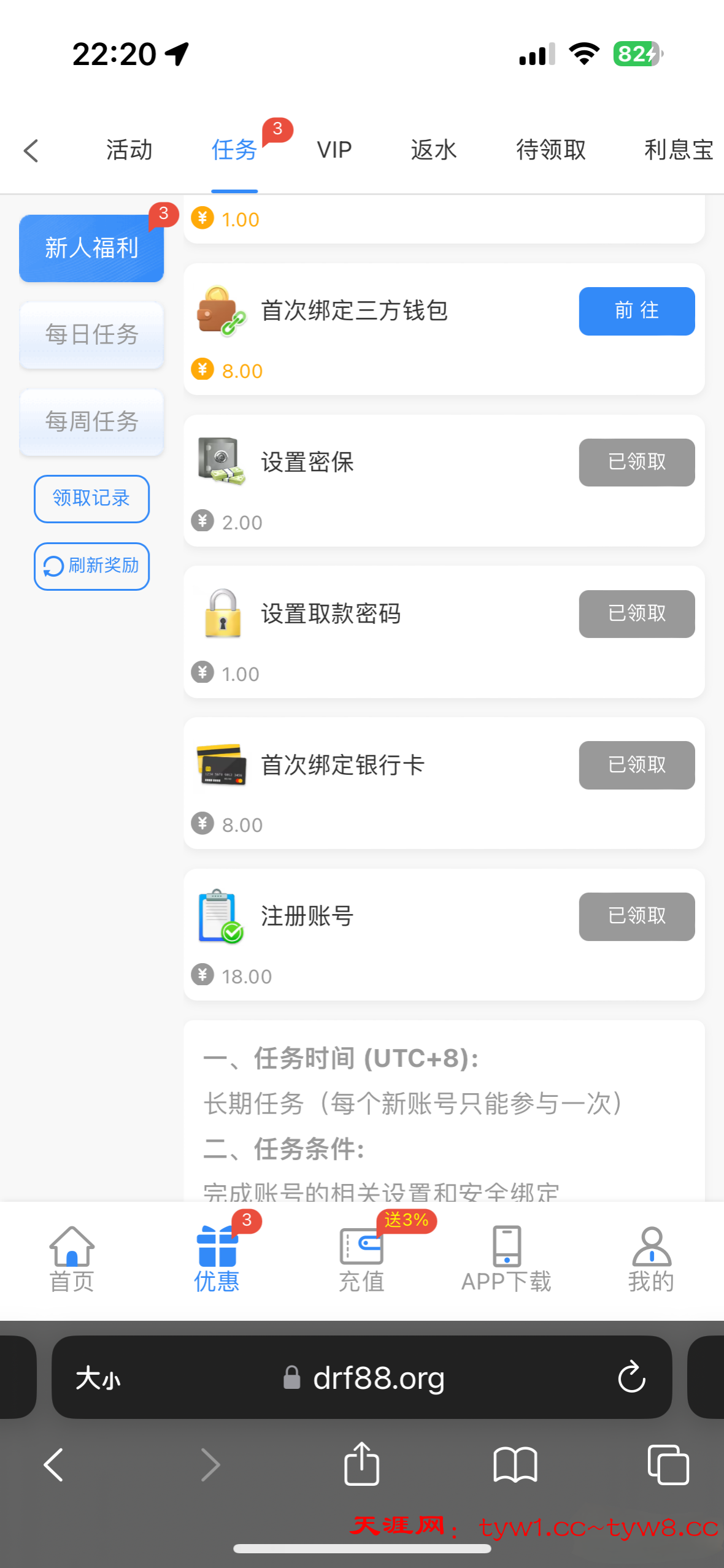 新人任务秒领18 其他任务一共领了29,注册直接点任务领取 没有就是黄了