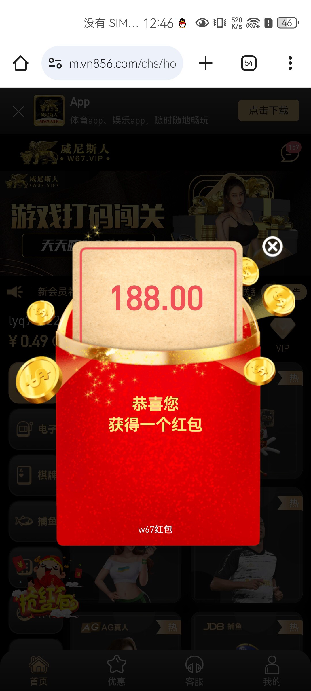 打电话送了188回访彩金 登录就有的 找客服没用 可以去碰一碰 网址w67.vip