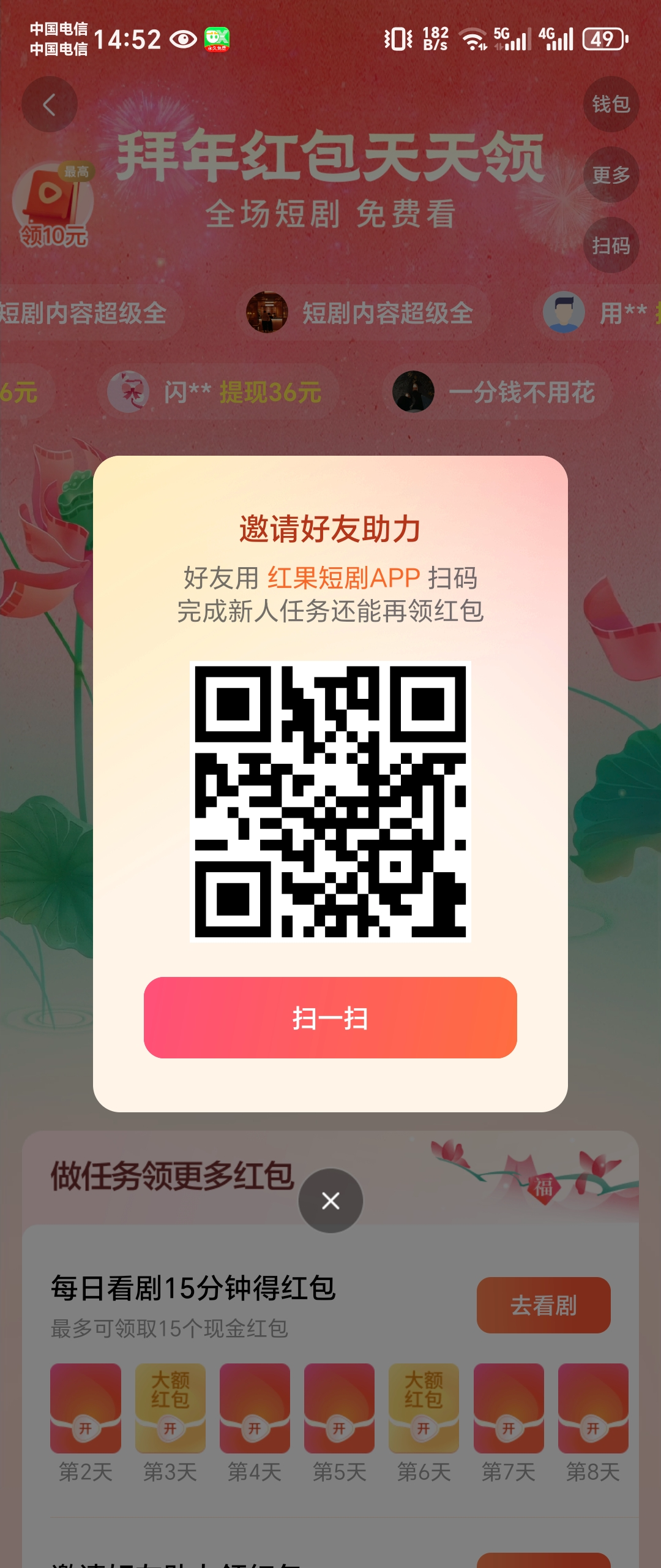 教程:软件城商下载《红果短剧》app 扫码图2进入活动 拉5-6个人助力就可以直接到账。