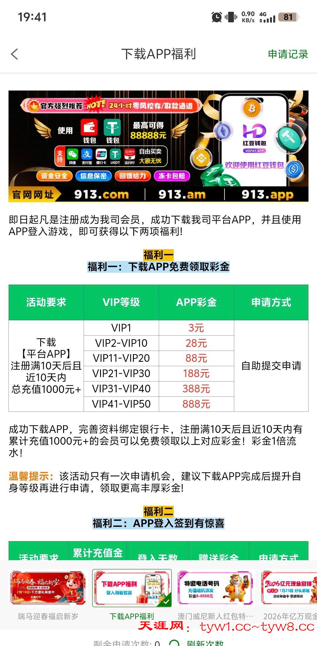 913近期有充值的去申请最新活动下载app.彩金