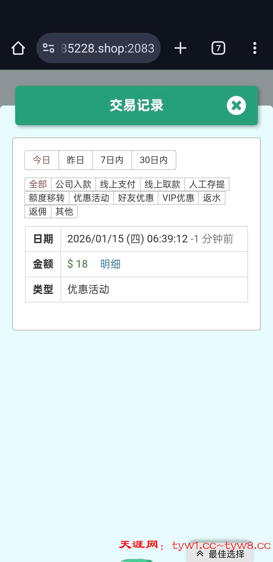 点了个新葡京本来想注册碰瓷的,结果有账号登录后找客服申请回访彩金。就提供了账号也没查手机 送了18彩金  满188提款 只能指定钱包提款。我没打出来。