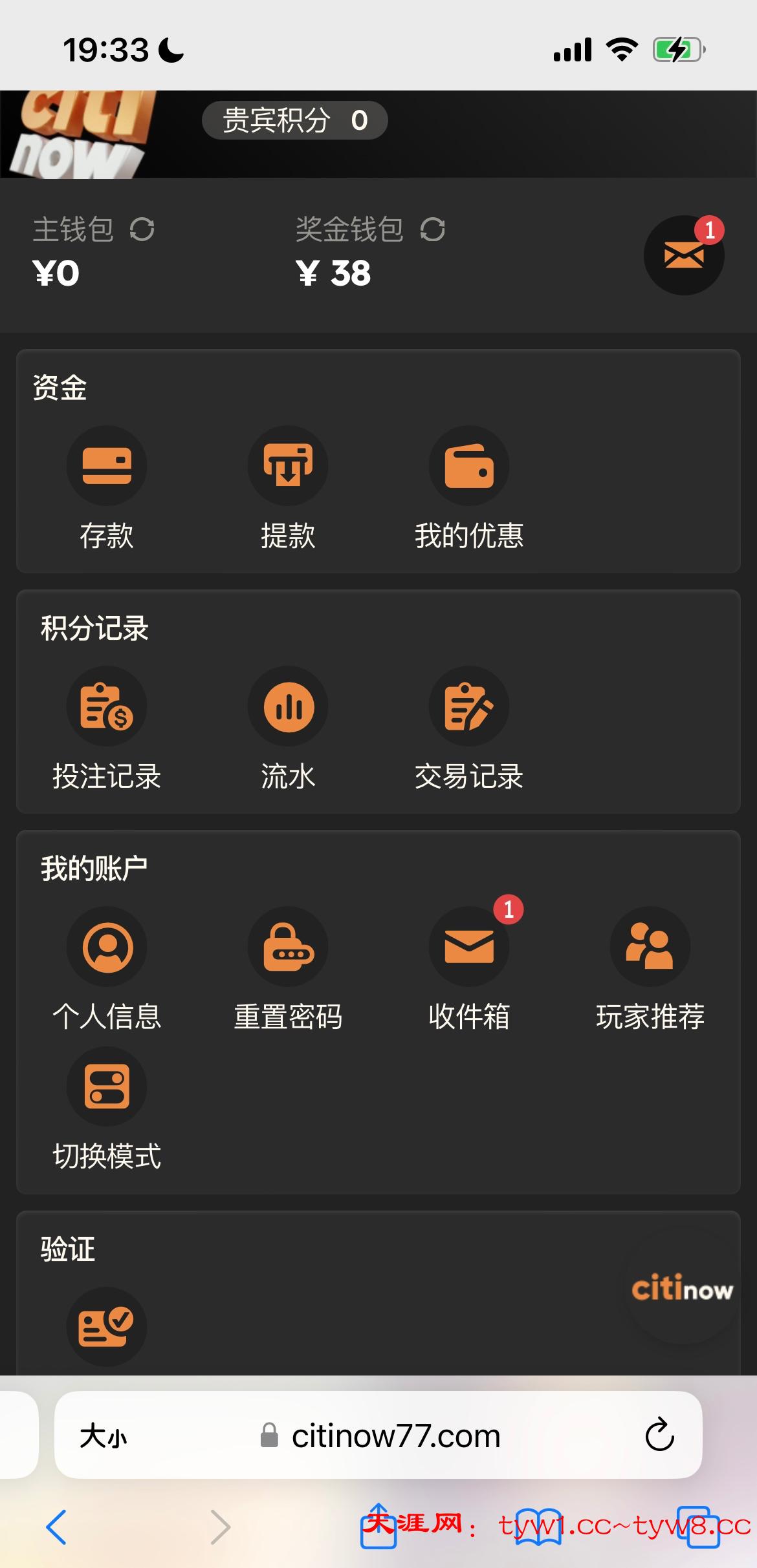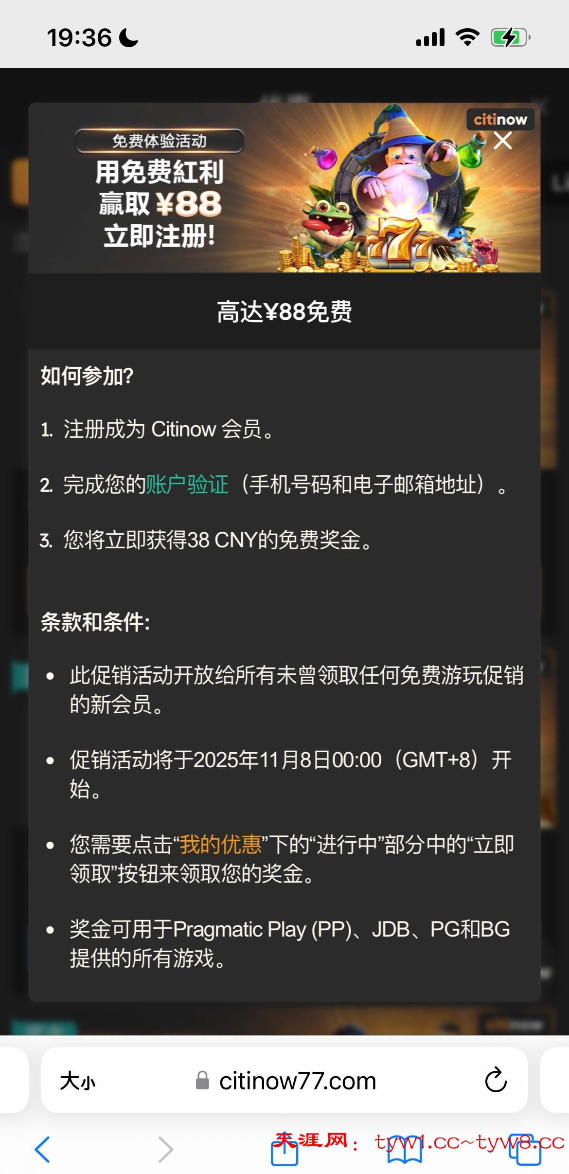 注册账号了手机号接收不到验证码的话找在线客服申请手动验证,客服会让你加客服微信验证就可以了,验证完在个人中心我的优惠里领取,要打190流水才能转出中心钱包,网址https://citinow77.com/cn/cn