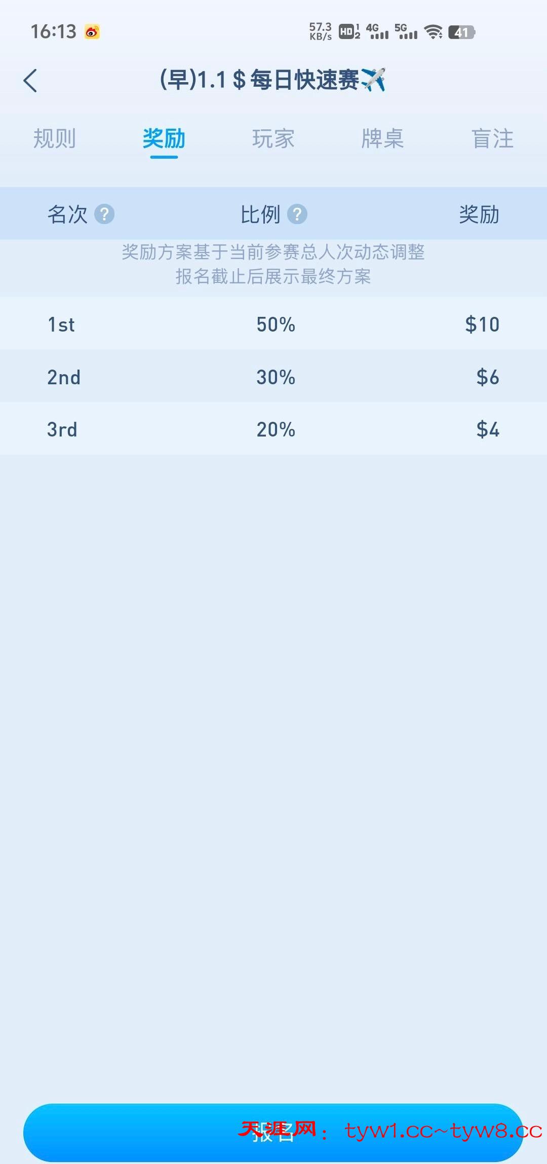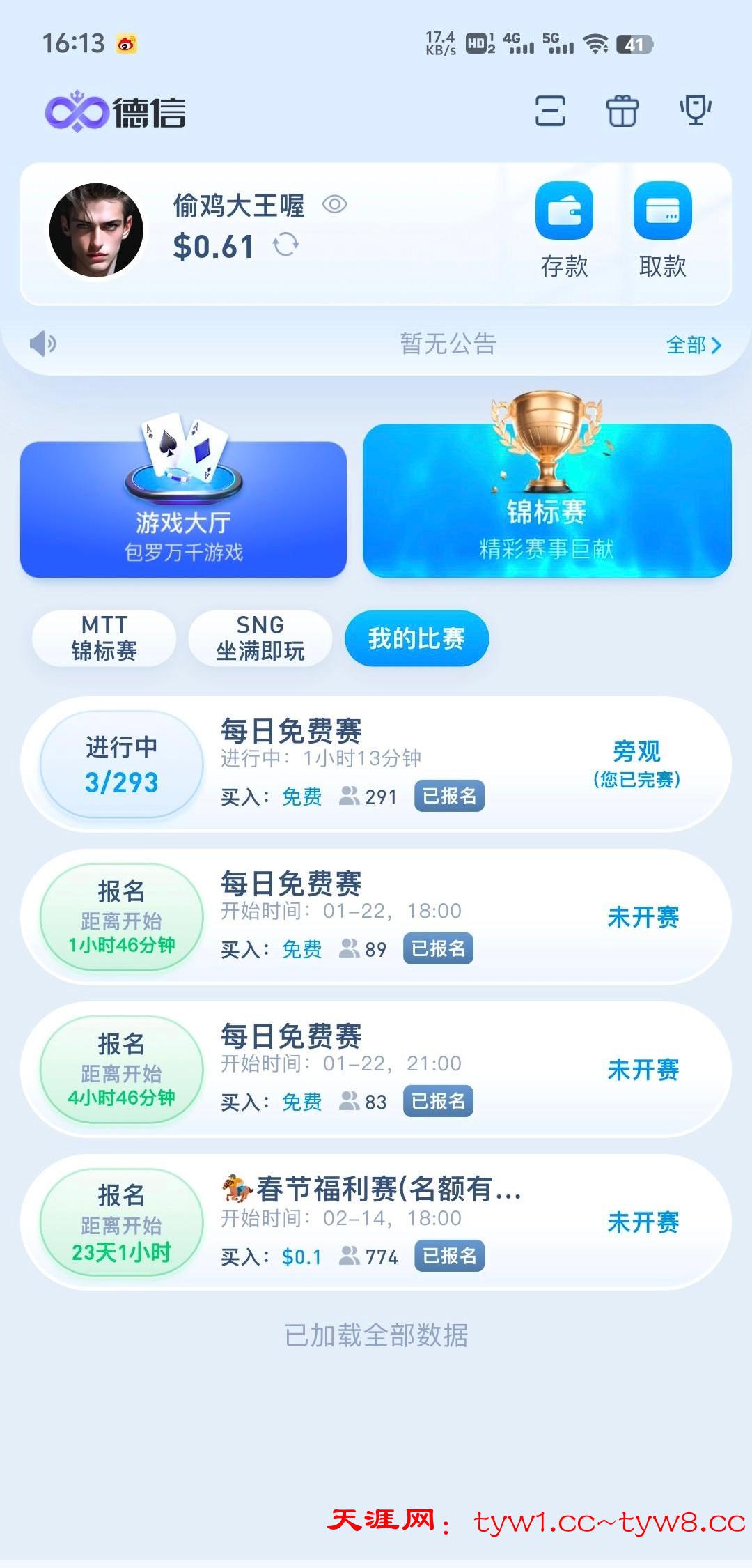 这个每天有四场免费赛,12点,3点,6点,9点,只要打出够1.1u,就去打每日快速赛1.1,2.2的比赛这个基本没什么人报名玩,最多10人进,只要稳一点基本可以吃前三名,够50u就可以提了,我打了两天已经到账50,白嫖即可不要充值官网DX.vip