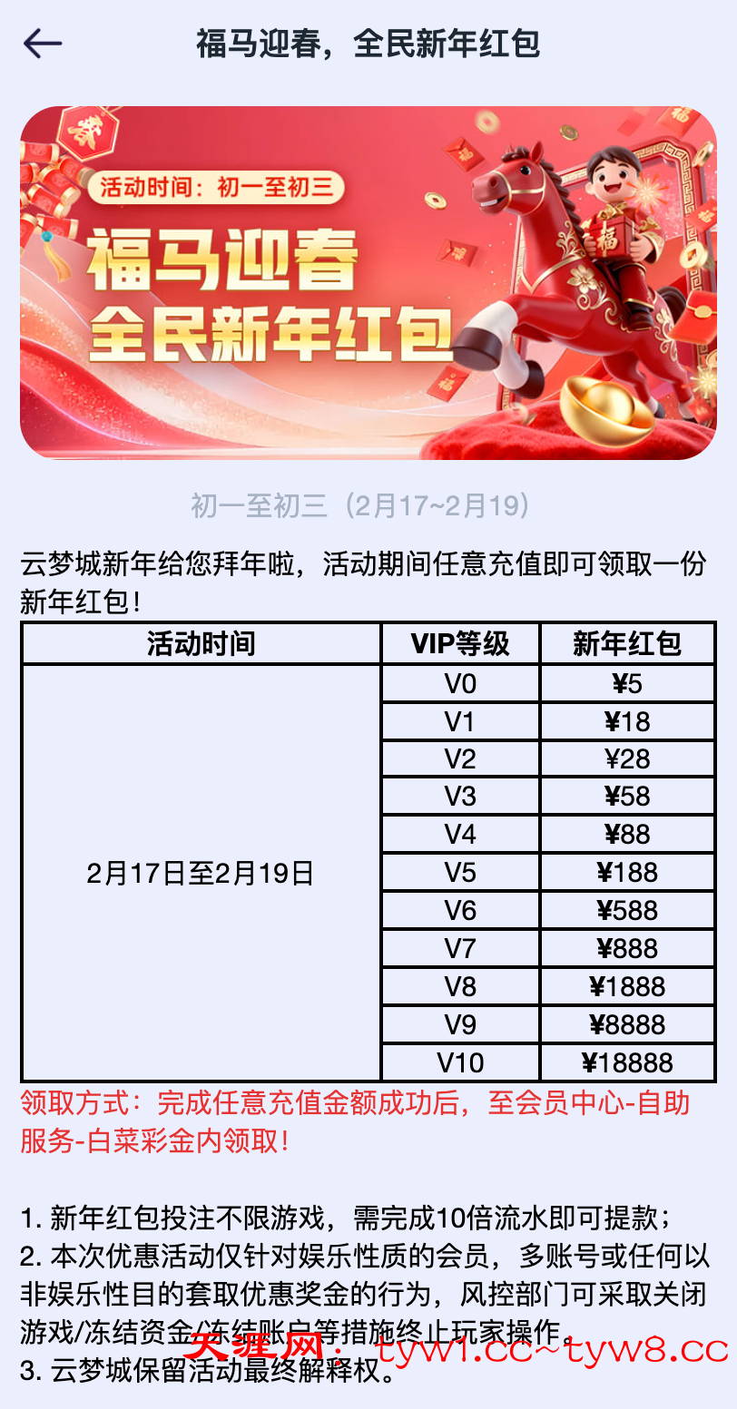 奖品内容: Coc云梦城新年转运彩*100