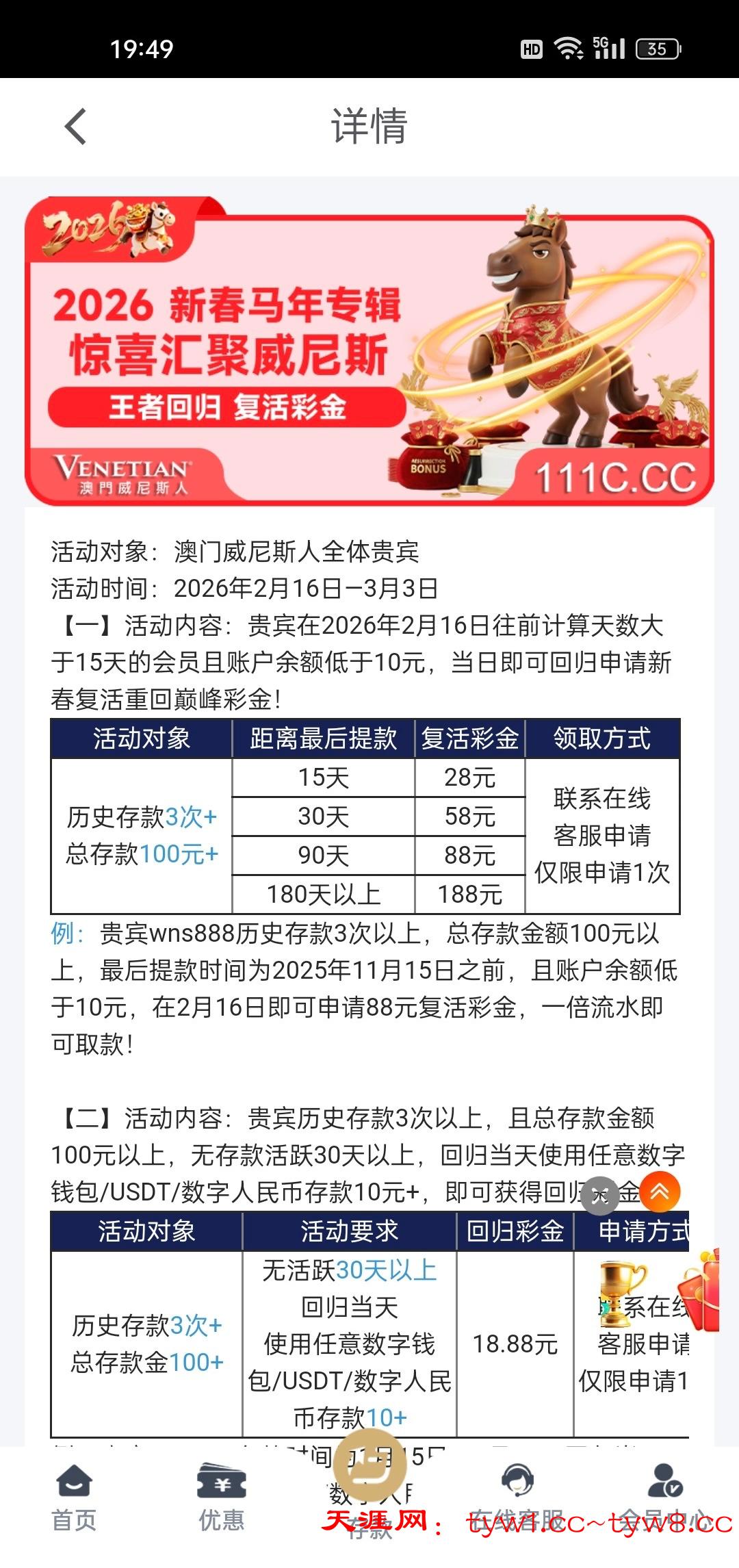 威尼斯回归180天未登录可以领188,勿充值白嫖即可链接111c.cc