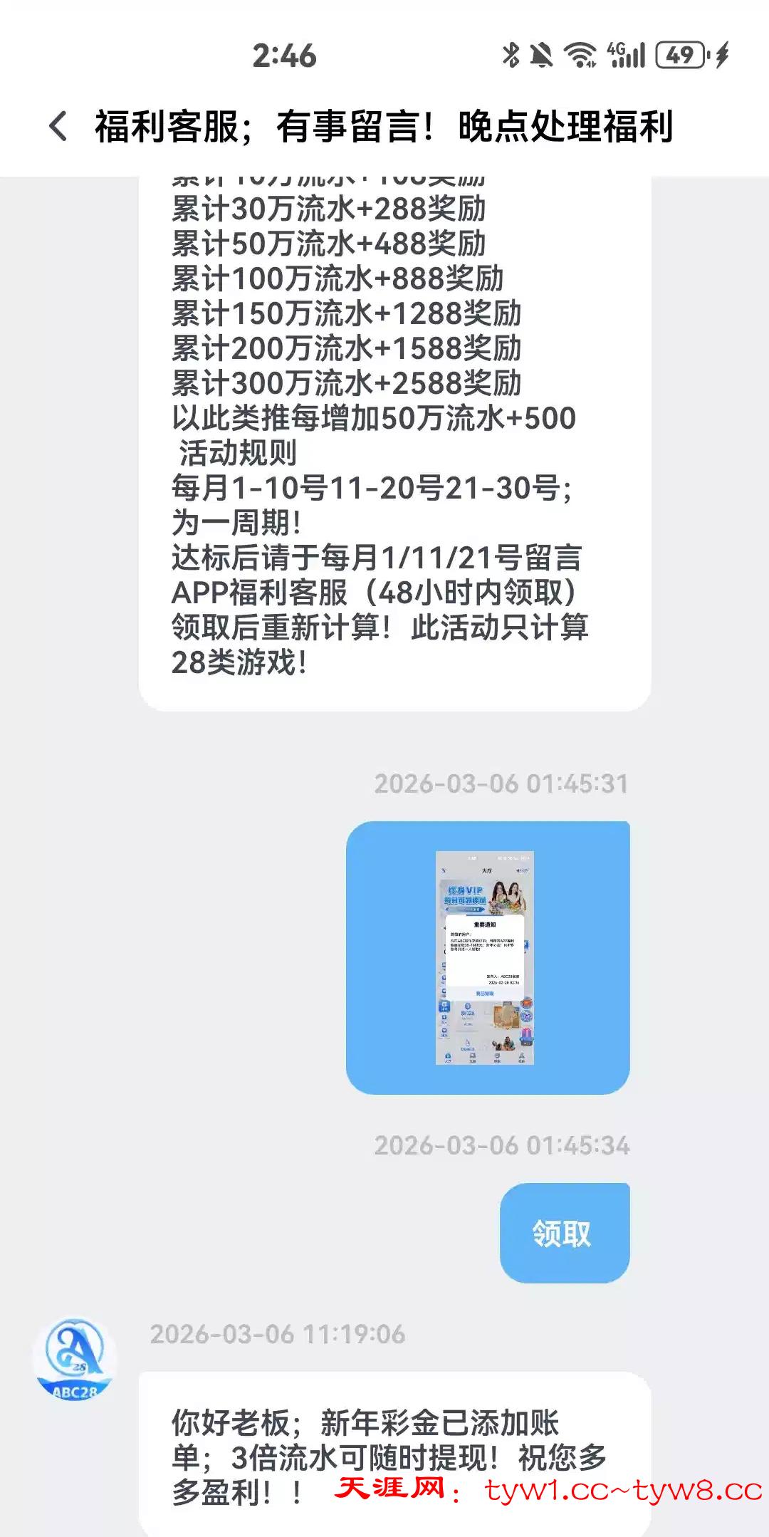 上个月19号领了58,今天月礼金上号看见公告联系福利客服又领了38 链接 abc28.xyz