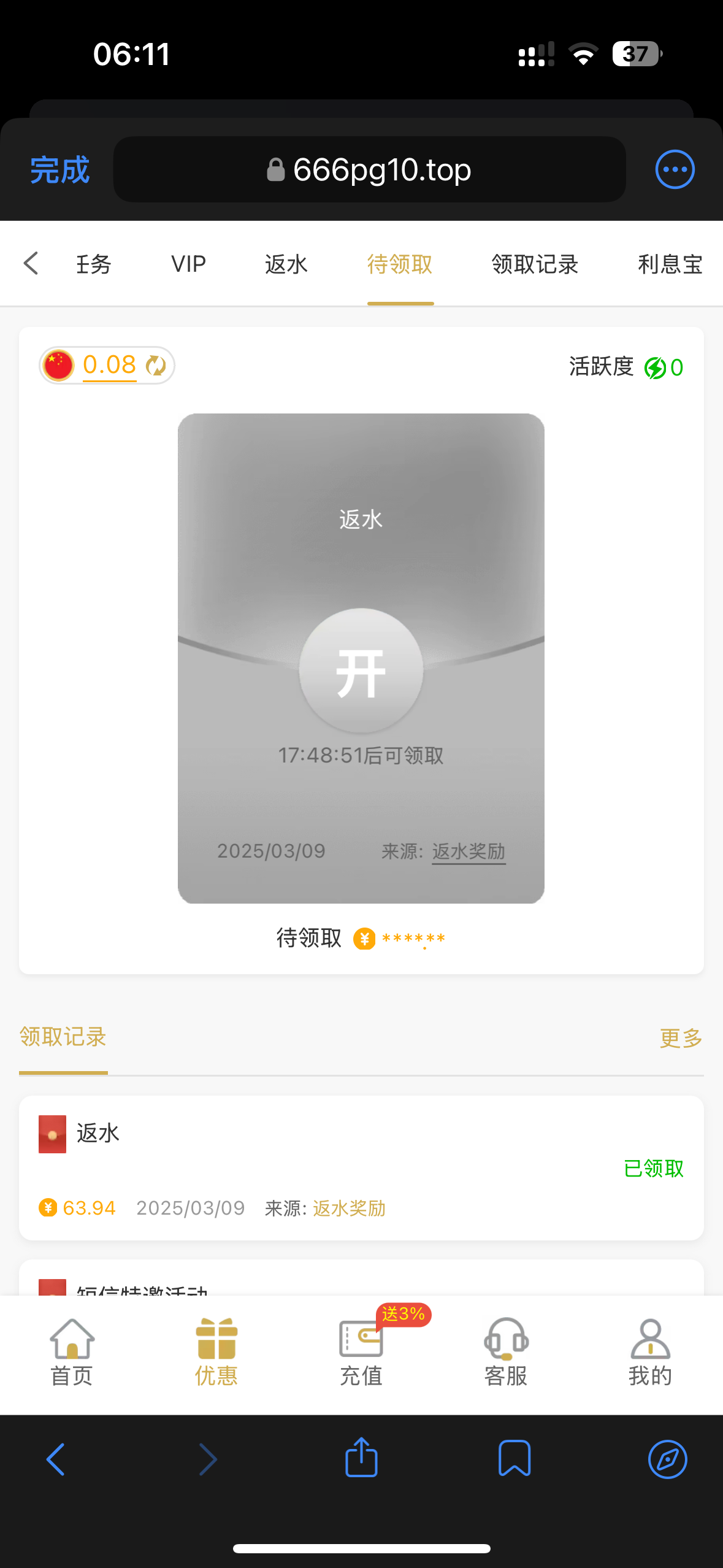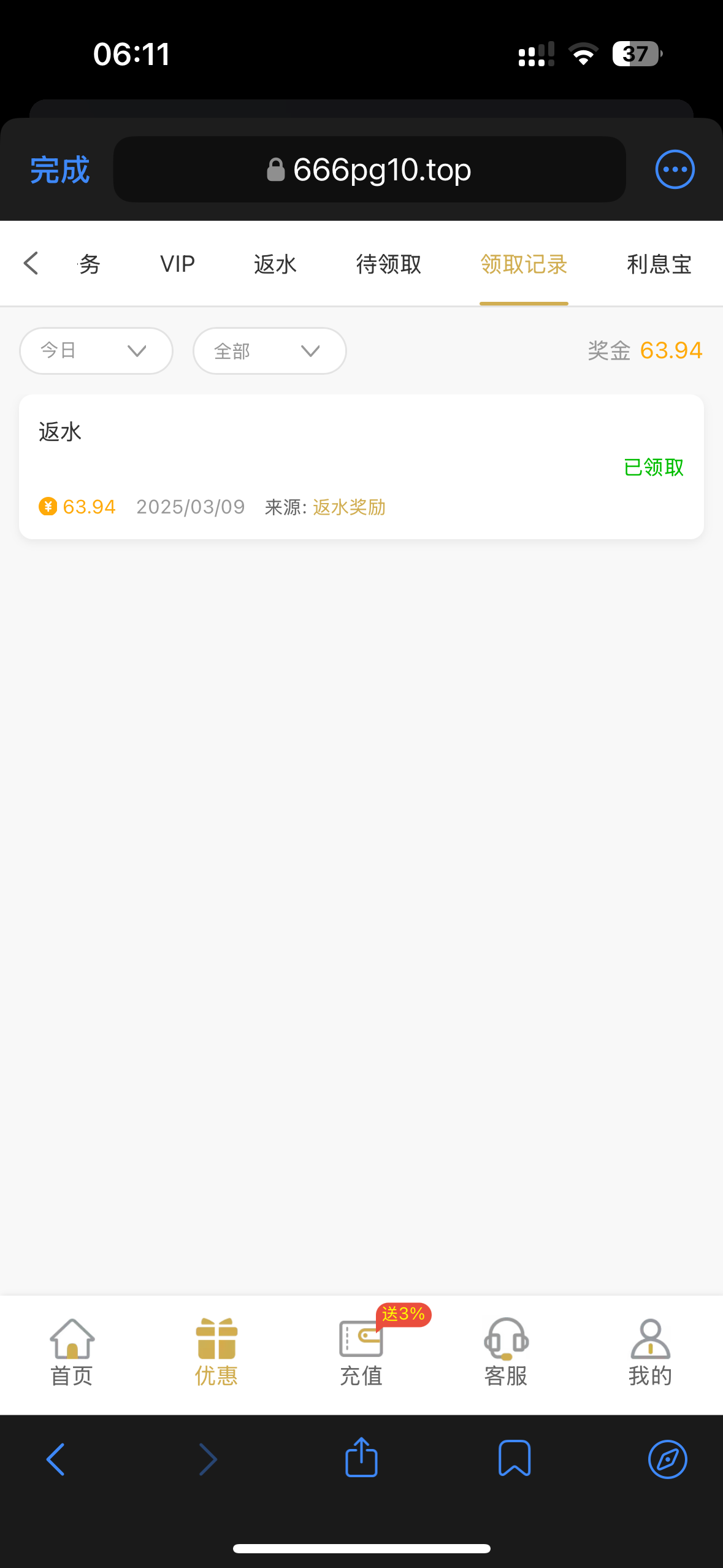 之前玩过注册彩金 今天上号一看返水出bug了 给了60多 有号的可以上去看看有没有