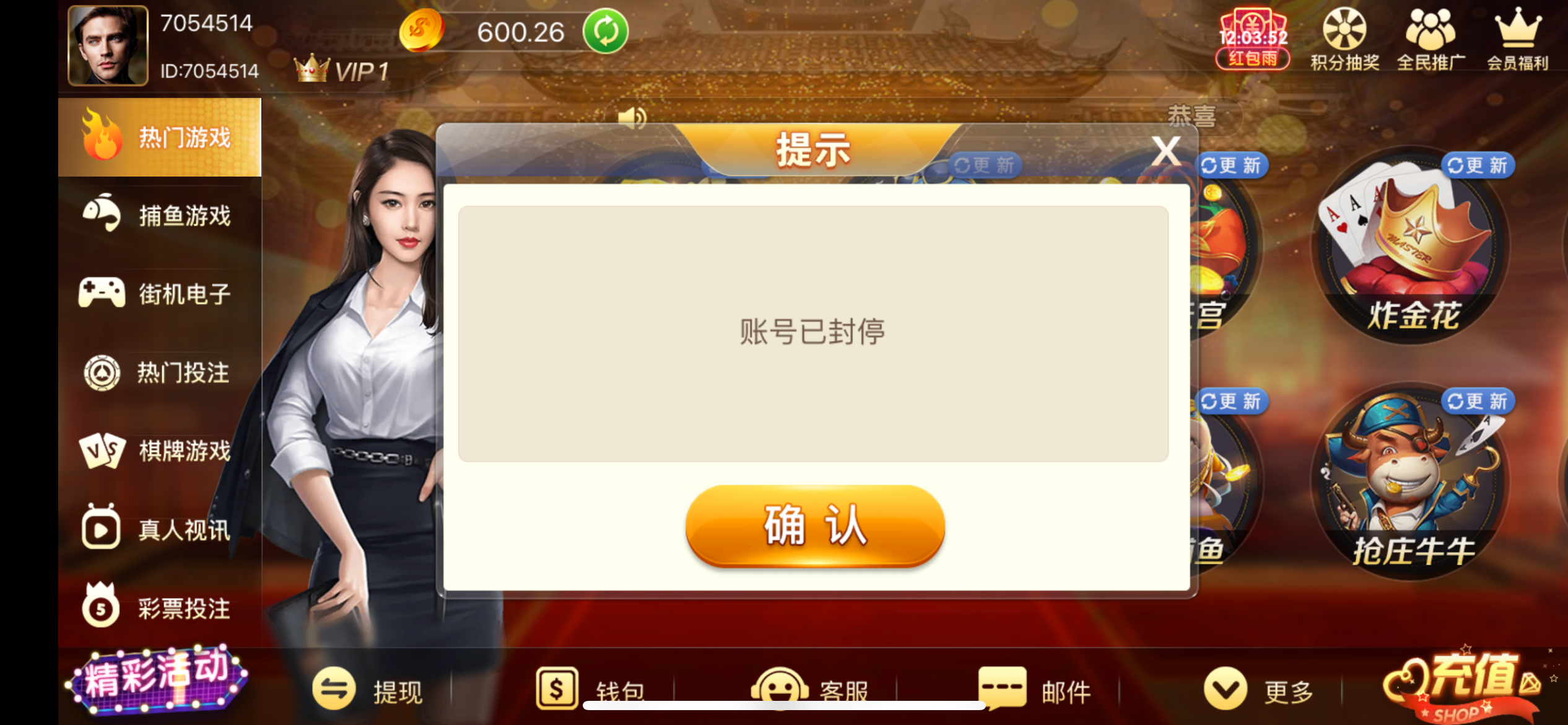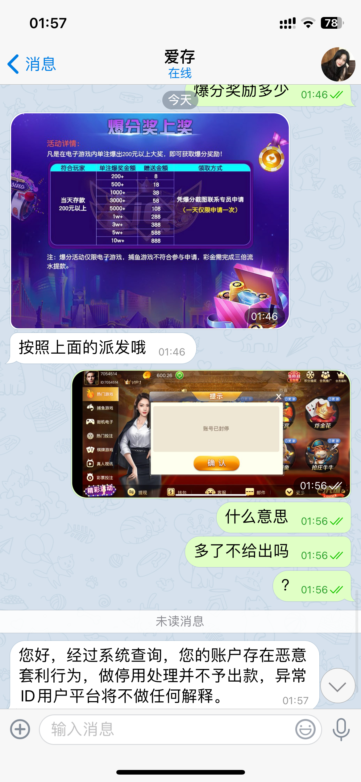 之前一个横屏的开元也是一样,冲100拉2块的胡爆了1800,直接说我下注异常,扣除