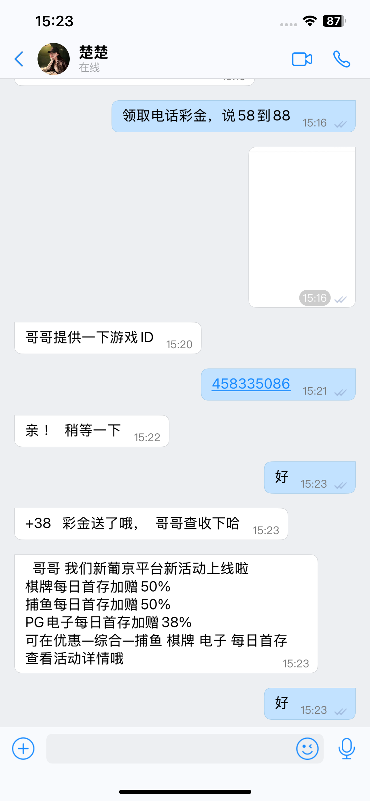 先向客服提电话彩金,客服会让你下载68,加专员,加上专员,提供电话截图送38。我是电话回访送的,你们可以试一下。