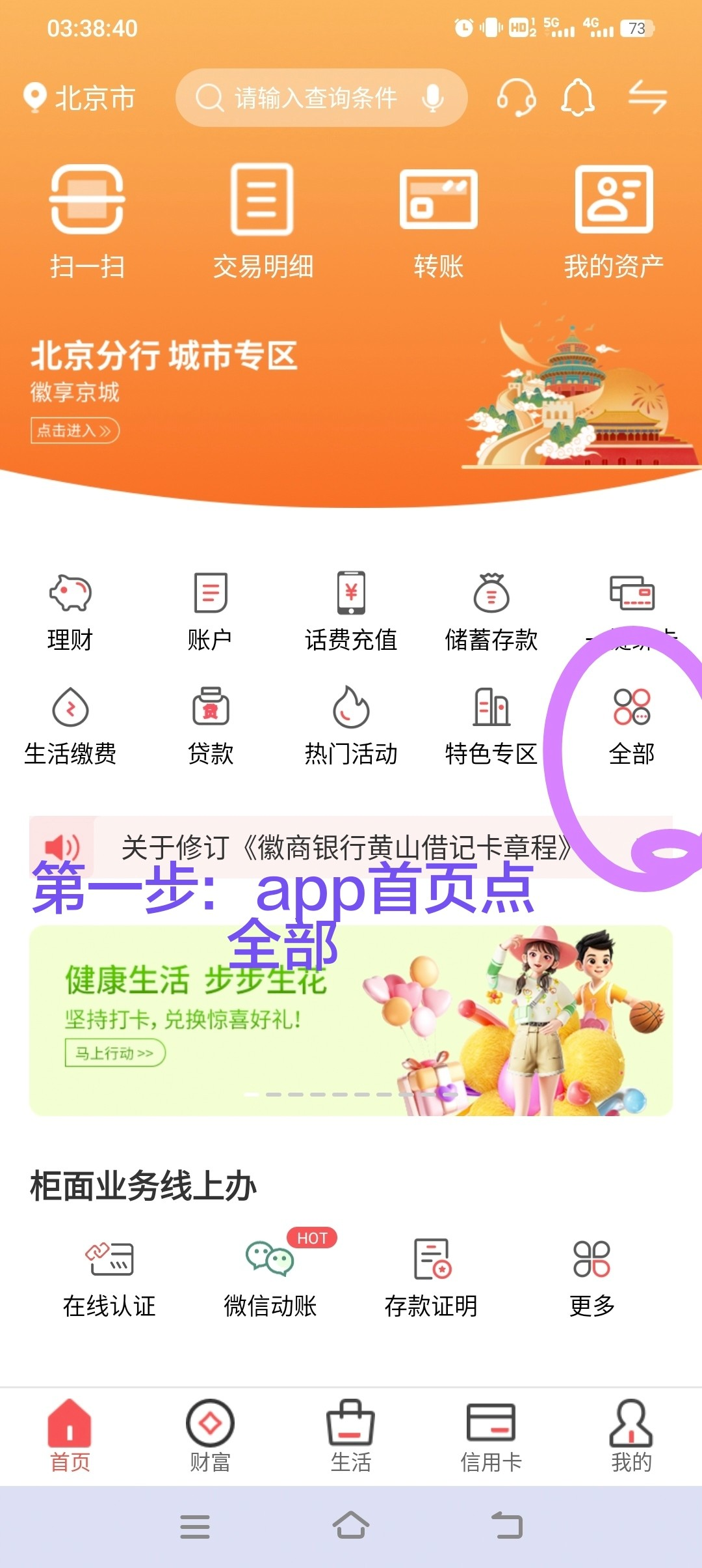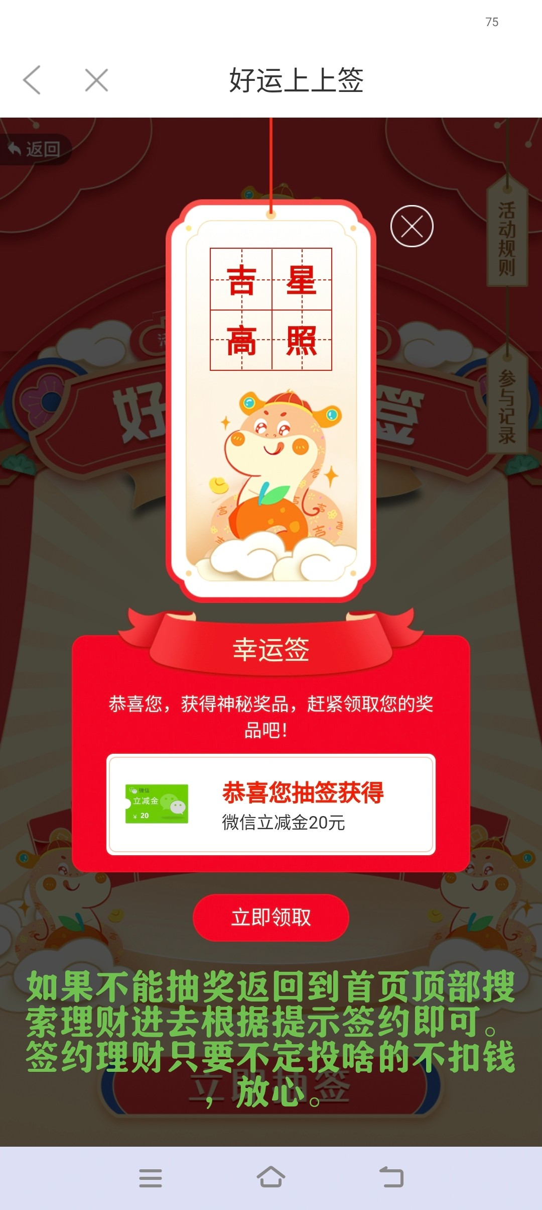打开app首页全部,找到那一栏便民生活,微享生活,乘风破浪财富领航,新客见面礼,可能刚开始显示不支持,回到首首页搜索理财一键签约在回去就能领了。