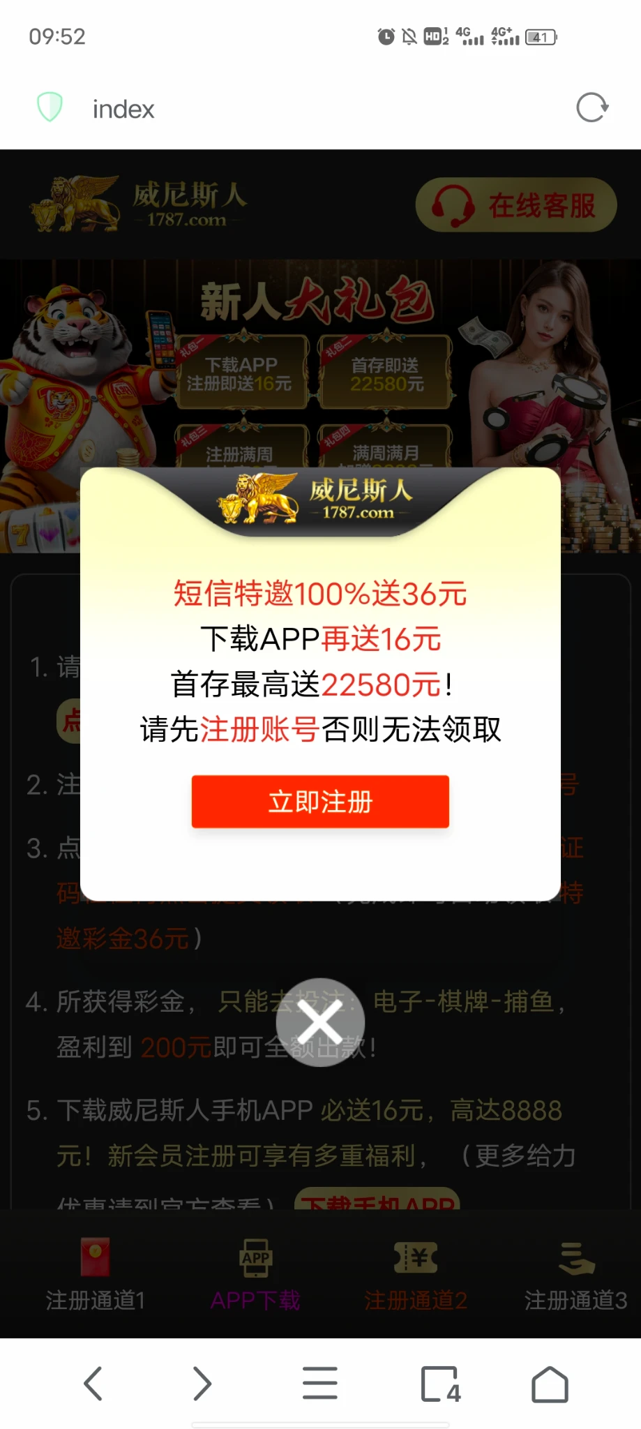 新老用户注册后点击优惠-短信特邀贵宾输入手机号碰瓷秒36元/十倍流水最低200提现