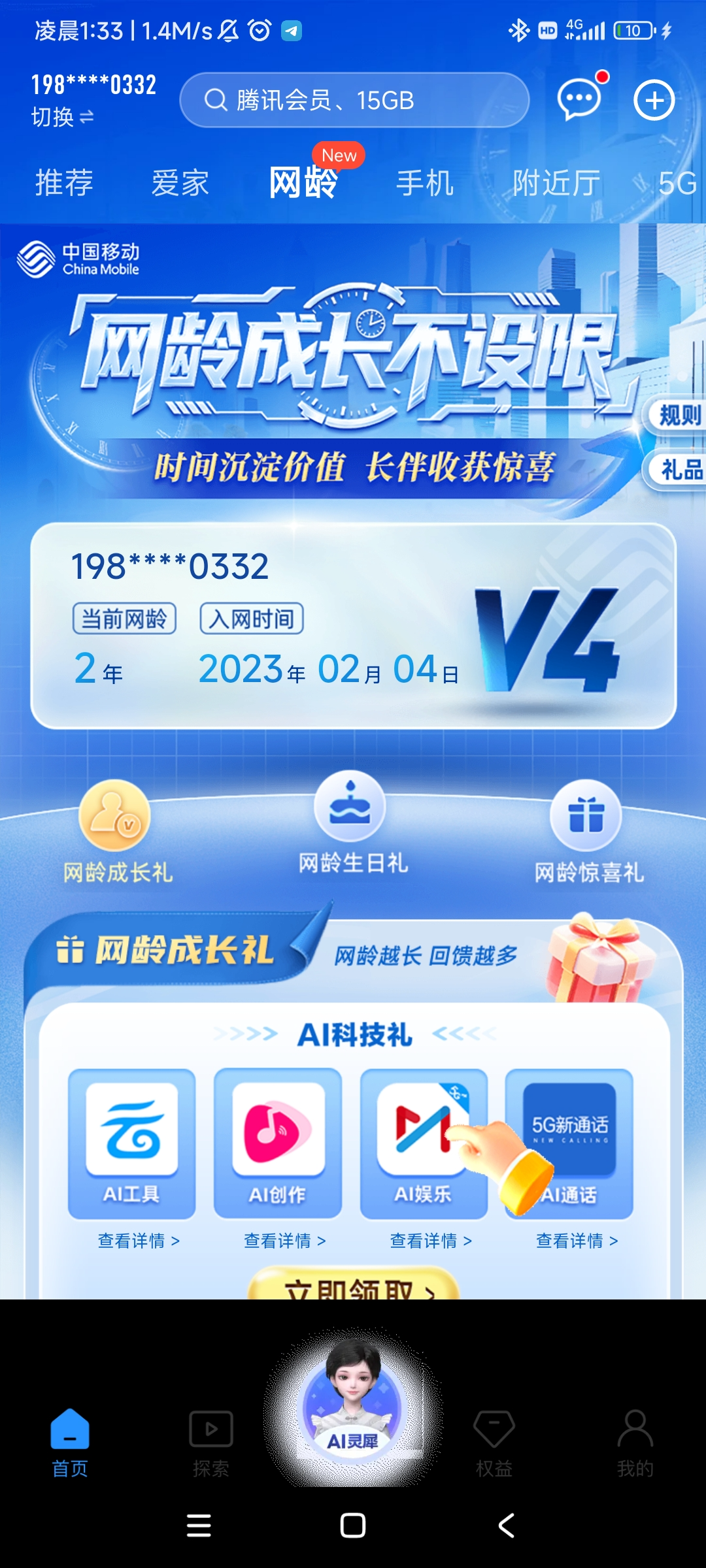 我那个手机号就两年领了一张。可以挂闲鱼卖15。挂壁仔可以行动了,进中国移动首页就能看到