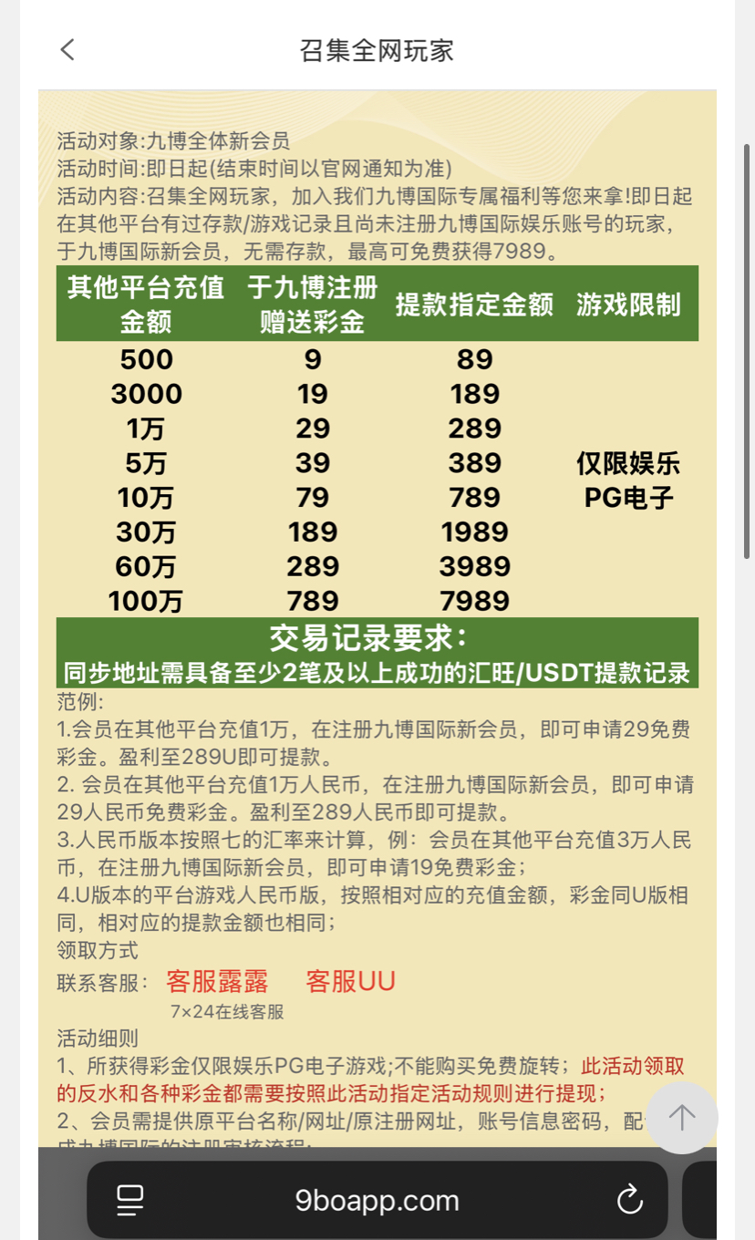 注册账号 然后联系飞机客服 提供别的平台账户密码 查你的充值记录 这个查记录 要有那种显示总和金额的 或者联系你提供的平台的客服 客服告诉你你一共充值了多少的才行 还要有提款usdt的记录 我申请到了 其他平台有大额充值的 可以撸试试 飞机客服号@jiubo_vip 平台网址 9bo.com