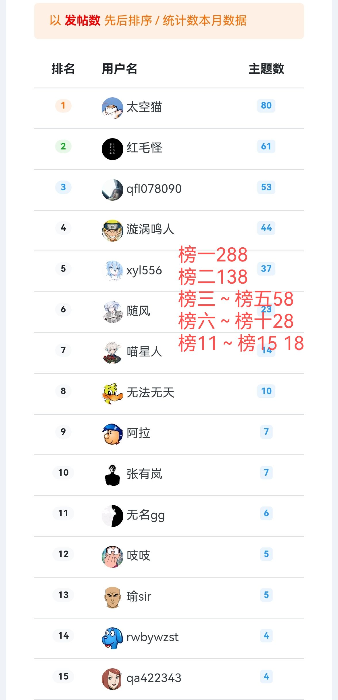 、公布五月优秀发帖者楼主奖励 有以下名单的楼主 - 联系阿飛处理奖励 请按照排名依次处理奖励:288~18!
