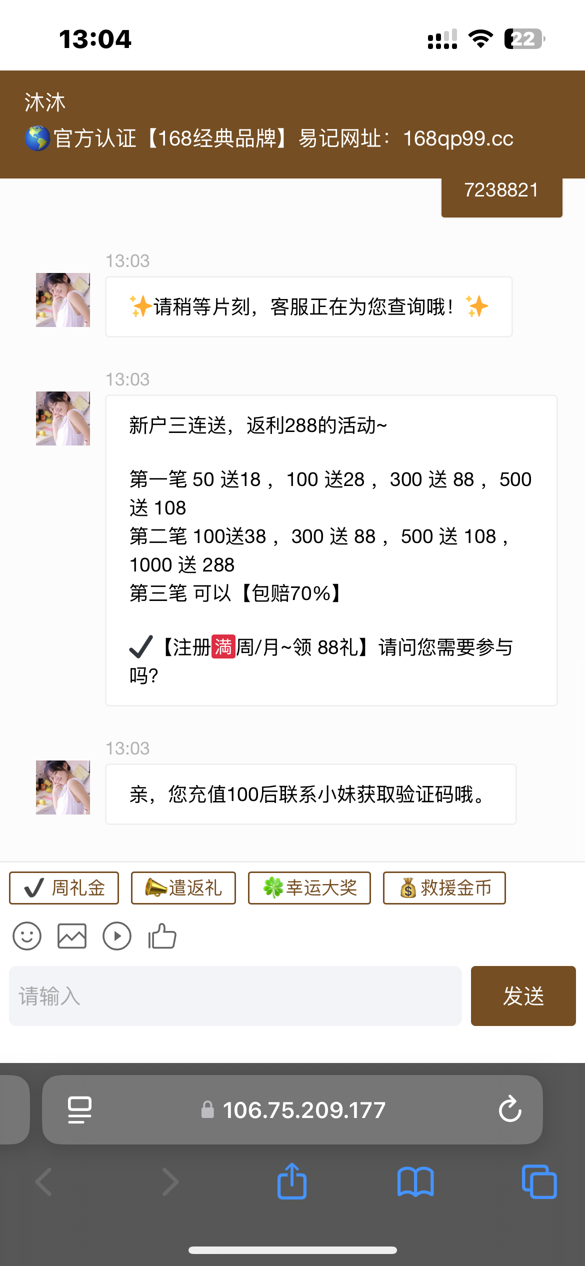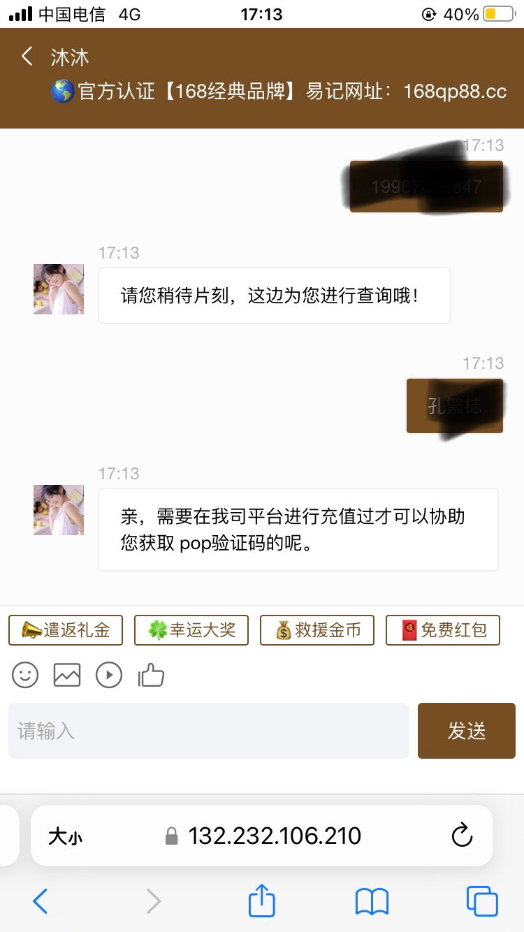 168客服如果问你游戏id 你就发给他 没有就临时注册 新人注册还有送8彩金 然后他就会问你手机号多少 到时候就会给你验证码了