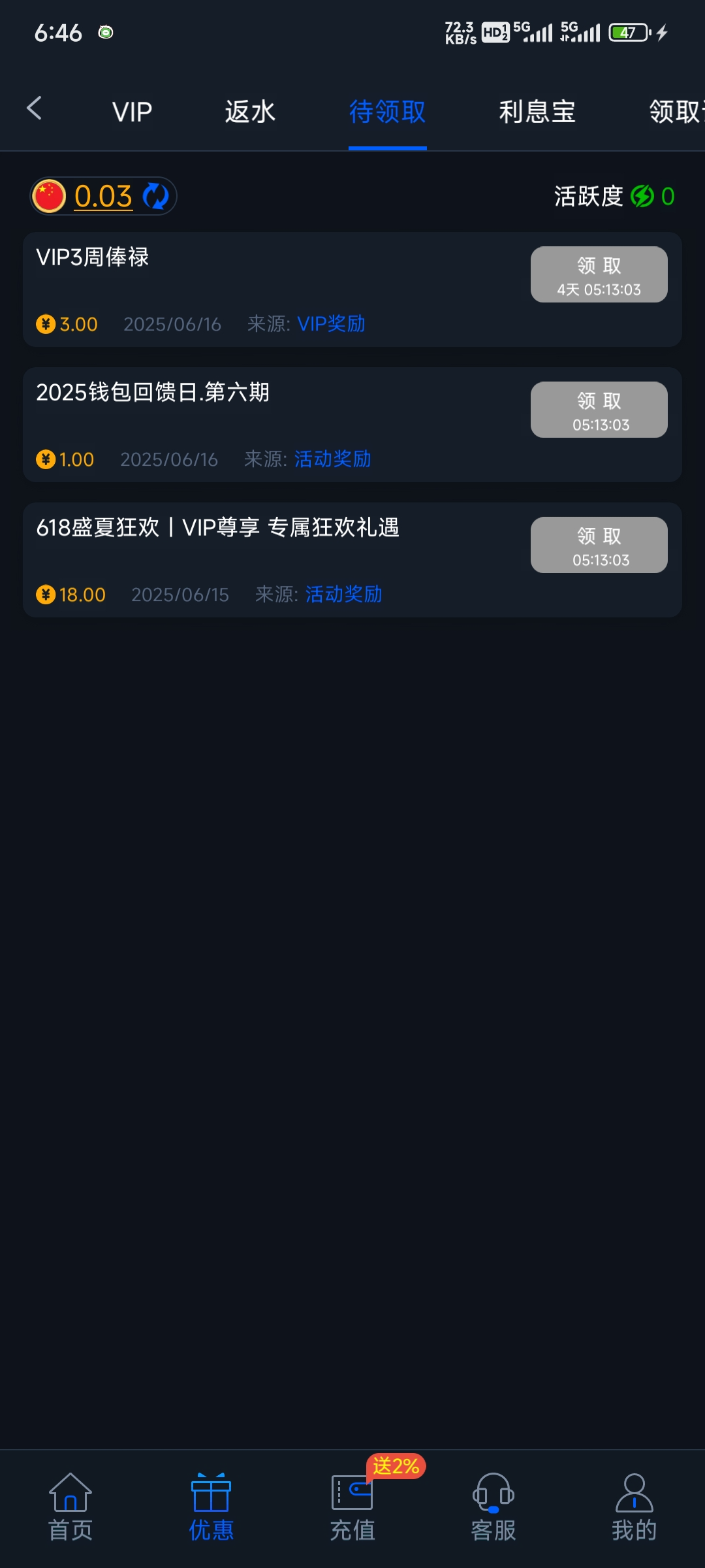 有号有vip等级的,过了12点就可以去领,最低10出款