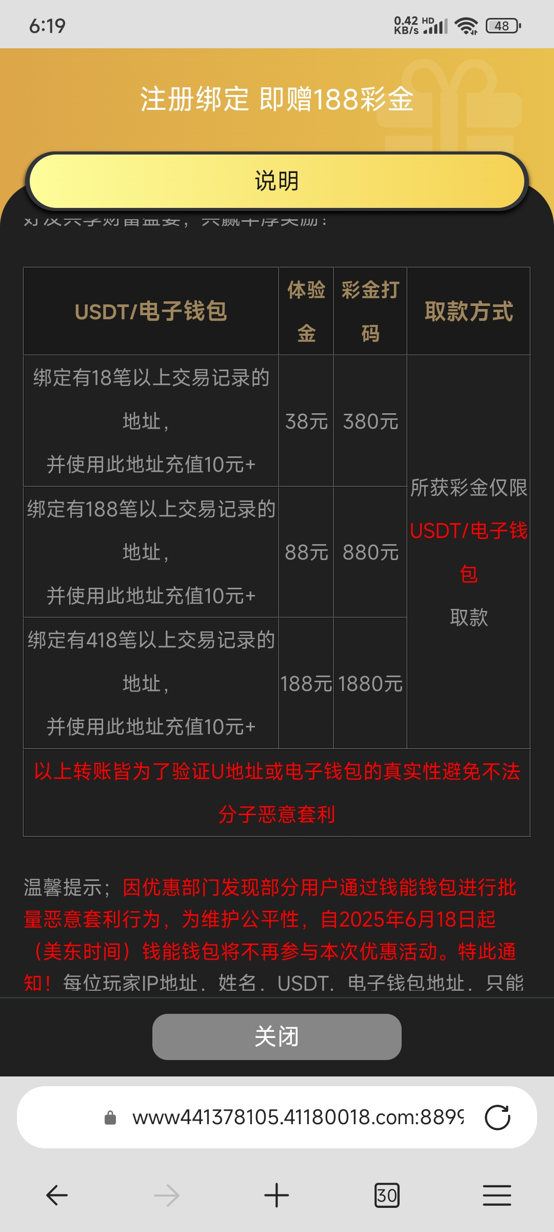 绑定常用的电子钱包或者u地址,然后用绑定的钱包充10块钱,去任务申请,满418笔交易记录送188,18笔送38,188笔送88,彩金10倍流水
